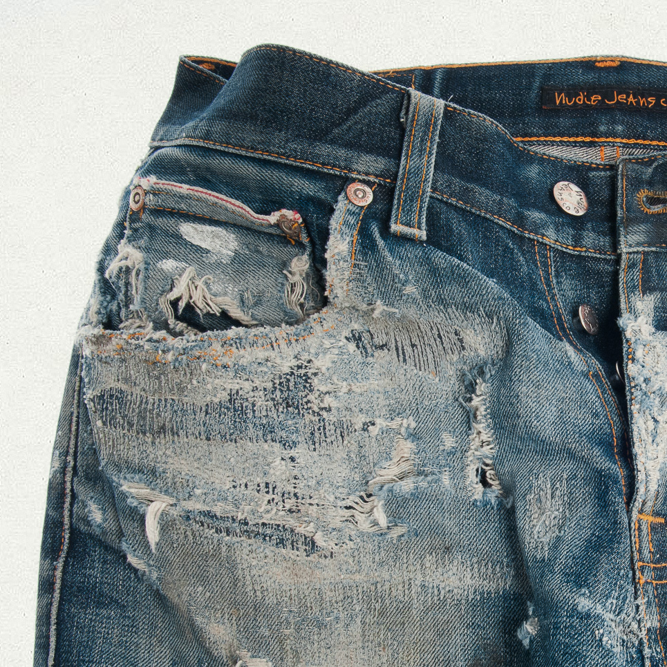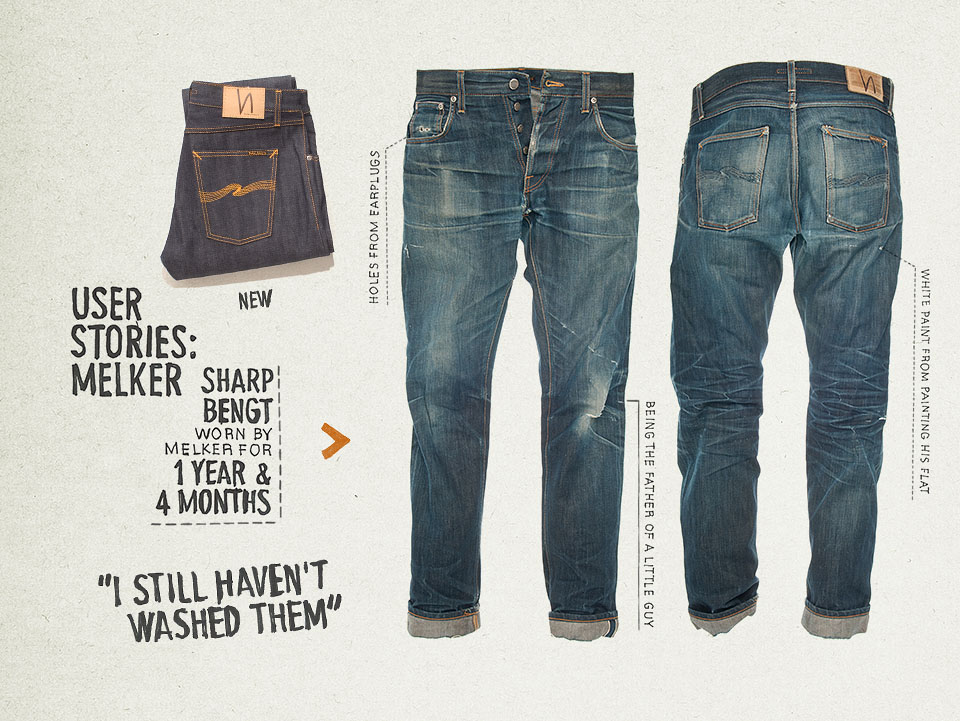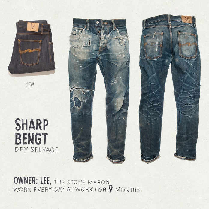 Chìa khoá của sự mê hoặc ấy có lẽ đến từ loại dry denim mà Nudie áp dụng cho các sản phẩm của mình. Nếu bạn vẫn còn thắc mắc tự hỏi “dry denim” là cái quái gì thì tôi xin được phép giải thích: Những chiếc quần jeans thông thường và phổ biến nhất là loại denim washed, tức là trước khi xuất xưởng và đến từng cửa hàng, quần được cho vào máy giặt với đá mài để tạo nên hiệu ứng bạc màu.
