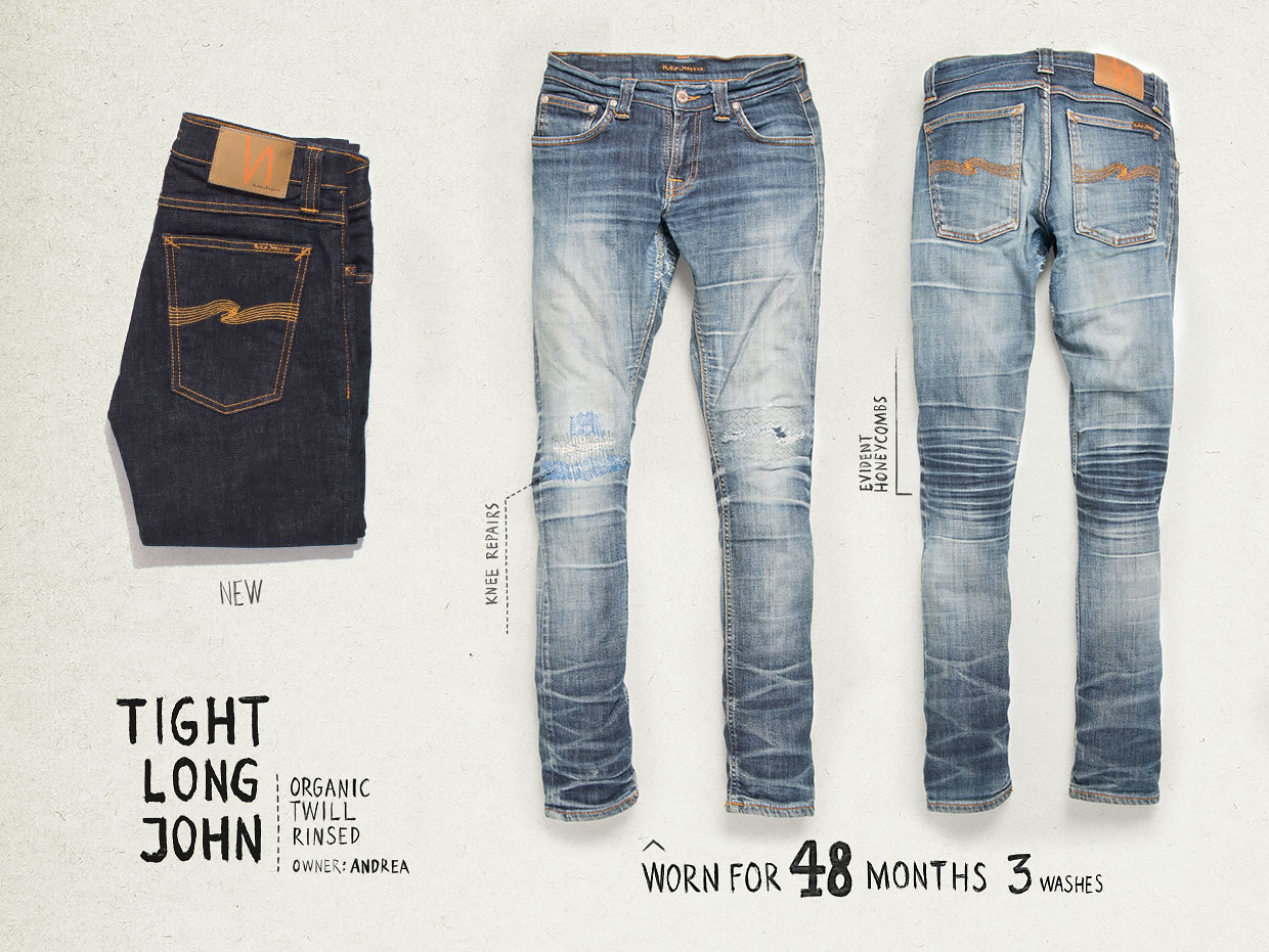 Dù mới ra đời được hơn 15 năm (1999), thời gian còn rất khiêm tốn khi so sánh với những Levi’s, Lee, Wrangler, v.v… nhưng Nudie vẫn biết khẳng định thương hiệu theo một cách rất riêng. Hãng chỉ sử dụng loại Organic cotton (sợi bông tự nhiên, không tẩm hoá chất) để cho ra đời những kiểu dáng mà chỉ nhắc đến thôi cũng như từ khoá khiến các tín đồ denim phải phấn khích: Tight Long John, High Kai, Skinny Lin, Tape Red…