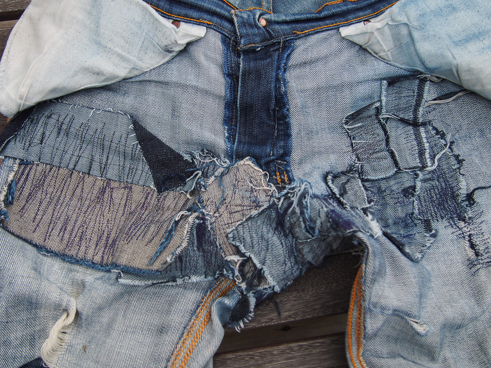 4 năm 3 lần giặt, đáng nể phải không? Vì mặc đã lâu, bị rách khá nhiều lại hay đạp xe nên phần rách đã lan vào tận phía mé trong của đùi, thế nên bạn này phải đem đi sửa lại, và cũng vì đem sửa nên mới đành phải giặt thôi.