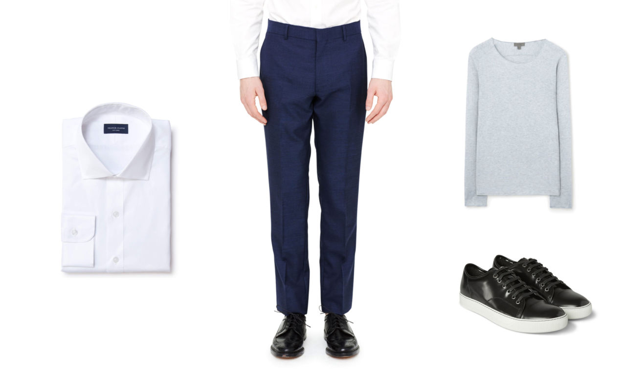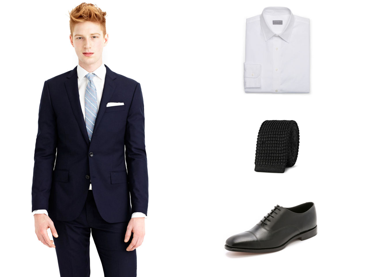 Bạn thấy đấy, đơn giản một cách hoàn hảo, set đồ này như bước ra từ “sách giáo khoa” của thời trang nam giới. Một bộ suit màu xanh navy kèm áo sơ mi trắng trơn, đôi giày da cơ bản. Bạn có thể nhấn nhá thêm bằng một chiếc caravat len đan dáng slim-fit cách điệu.