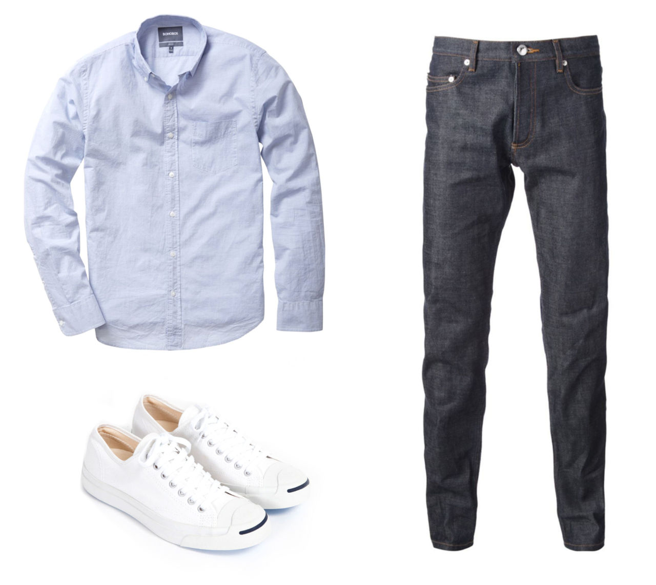 Một gợi ý không hề tồi cho ngày thứ 7 đi làm: sơ mi xanh nhạt dáng ôm vừa vặn không cần cắm thùng, jeans xanh indigo và cuối cùng là một đôi sneaker trắng hoàn hảo.