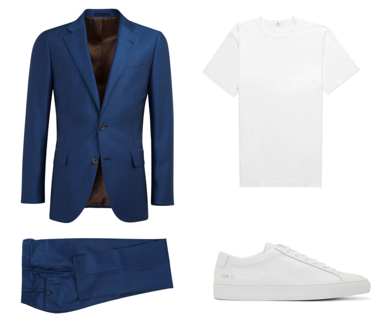 Đây là cách tuyệt vời để giảm bớt sự cứng ngắc của một bộ suit màu xanh sáng cổ điển: áo phông trắng và sneaker trắng