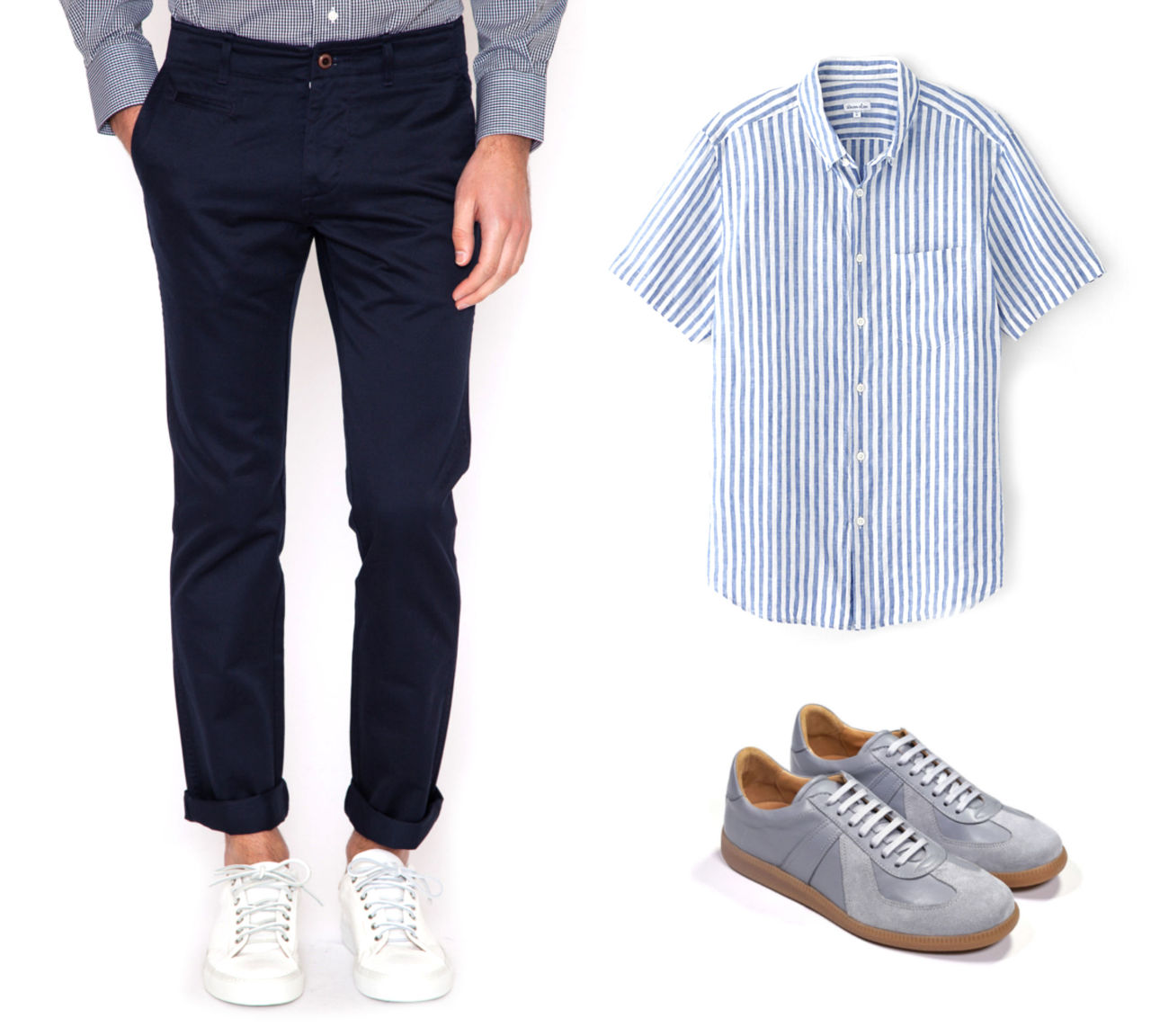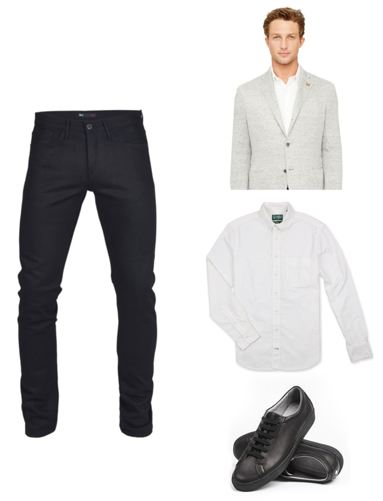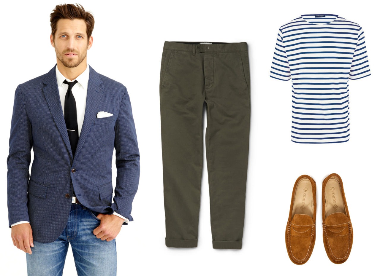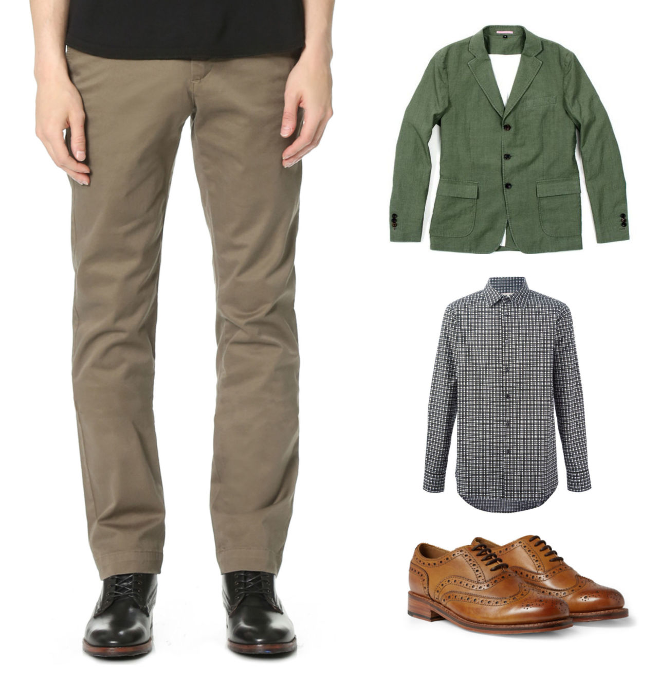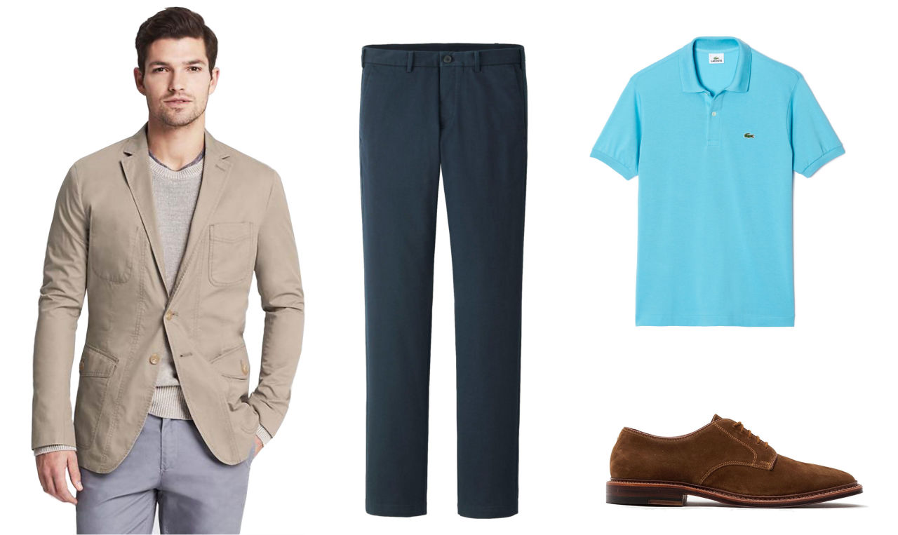 Áo blazer 1 lớp (không có lớp lót) đi kèm với quần chino màu xanh navy và đôi giày derby da lộn màu nâu. Một chiếc áo polo màu xanh nhạt đơn giản mặc bên trong sẽ là điểm cân bằng sắc màu hoàn hảo cho cả bộ trang phục.