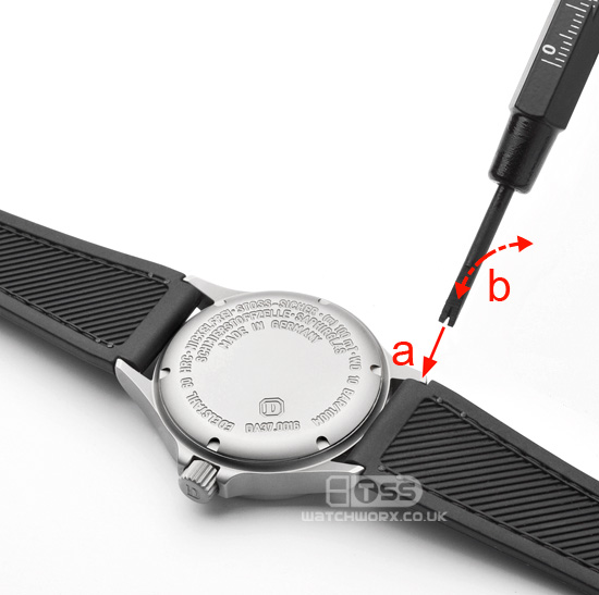 Để lấy spring bar ra, ta có thể dùng dụng cụ gắng len vào kẽ hở giữa dây và cạnh đồng hồ, ấn nhẹ xuống và hơi đẩy về hướng ngược lại với hướng cạnh đồng hồ. Và nhớ chú ý luôn úp mặt đồng hồ xuống, để lỡ trật tay thì không bị trầy mặt đồng hồ.