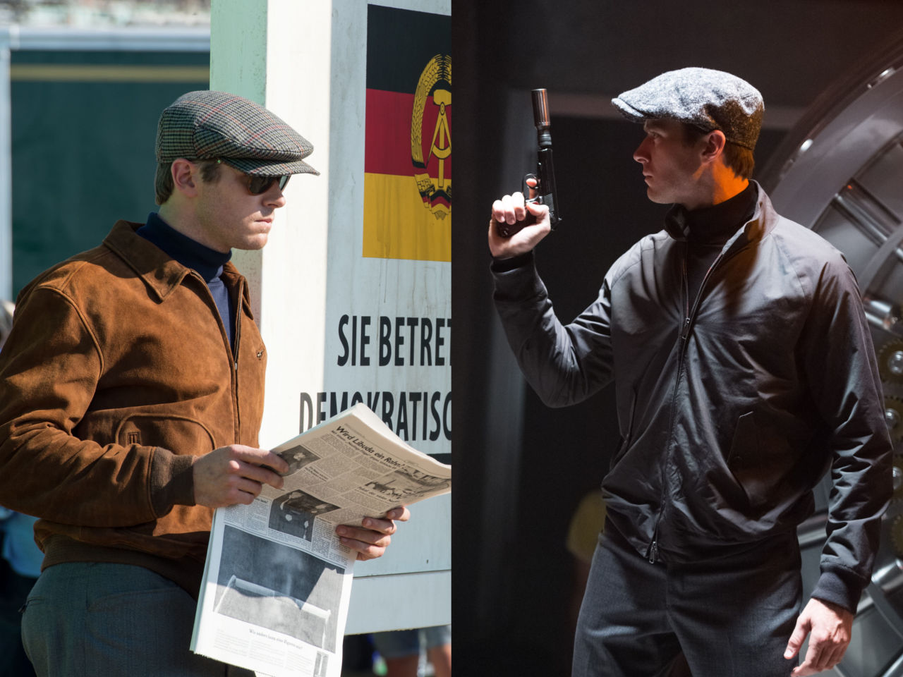 Ở nửa bên kia, chàng điệp viên người Nga do Hammer thủ vai, từ chiếc kính mắt cho tới bomber jacket, mũ nồi đều mô phỏng theo dáng vẻ của huyền thoại Steve McQueen.