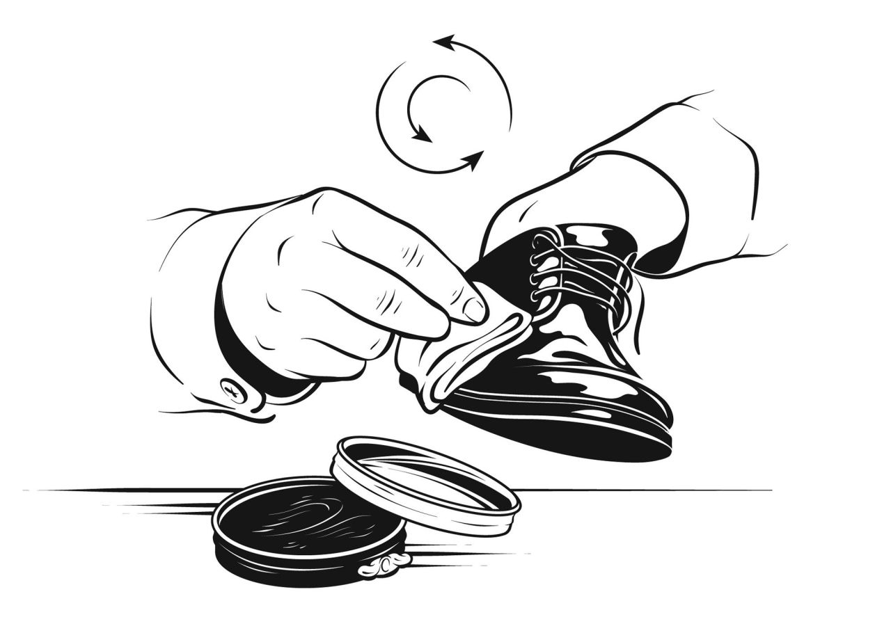 Dùng miếng vải chấm một lượng vừa đủ xi đánh giày (nếu dùng bản chải lấy xi thì chỉ cần chấm xuống sao cho xi bao phủ một lớp mỏng quanh bàn chải là được). Tiếp đó là bôi đều vào giày theo các hình vòng tròn, chú ý các khu vực như mũi giày, phần gót và thân giày với các lỗ xỏ.