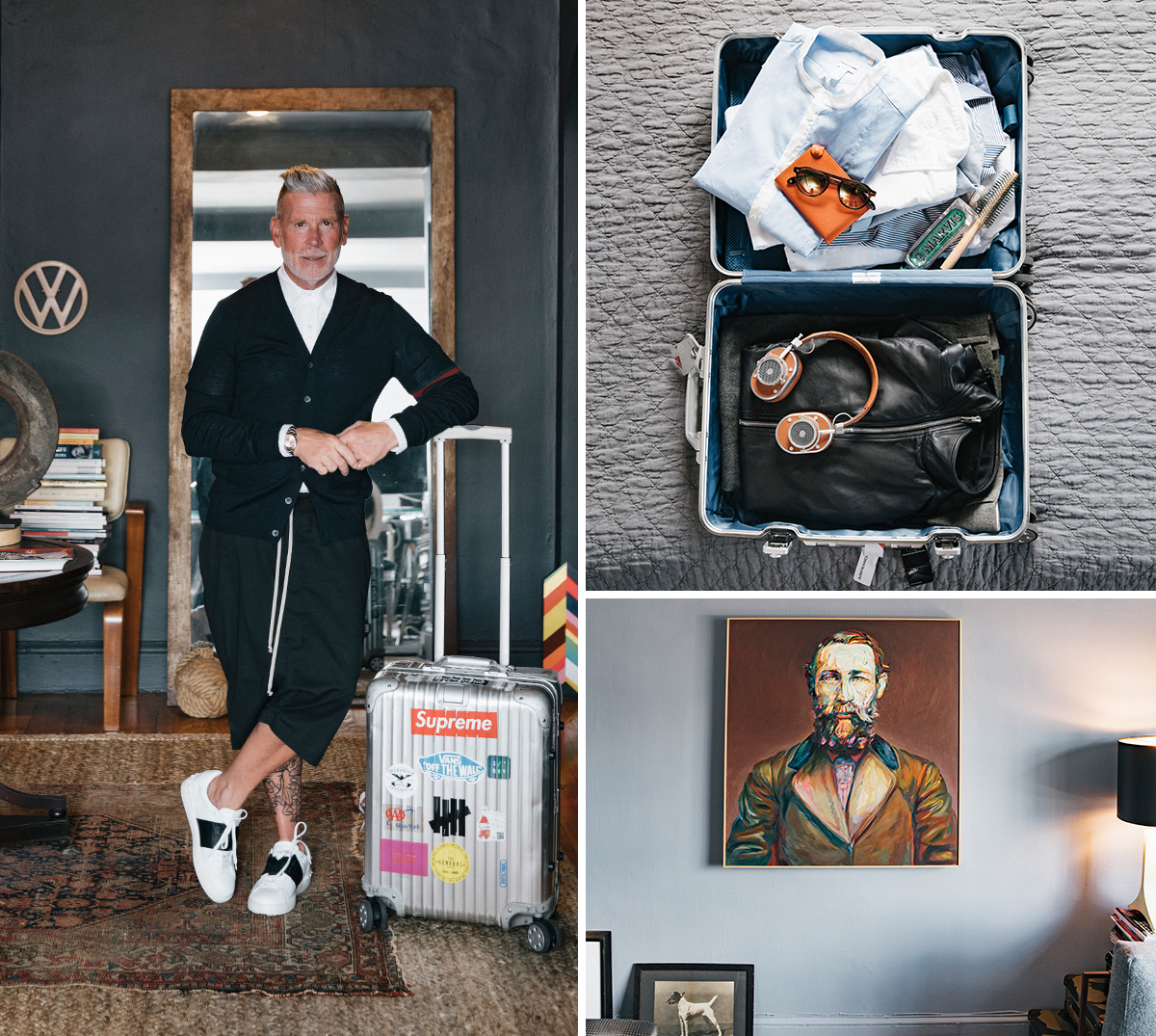 “Đây chính là hình ảnh của tôi khi trở về nhà sau chuyến công tác nước ngoài. Tôi là một gã thích mang vác lỉnh kỉnh nên thường xuyên phải trả thêm phí cho hành lý ở sân bay. Những món đồ không thể thiếu khi đi công tác của tôi: quần underwear, kính râm, mỹ phẩm. Những gì tôi mặc khi ra sân bay luôn thoải mái nhưng không bao giờ xuề xoà, đề phòng trường hợp cần thay đổi nhanh chóng phong cách. Trong ảnh là chiếc quần Rick Owen rộng rãi, tôi có thể mang đi ngủ cũng được“.