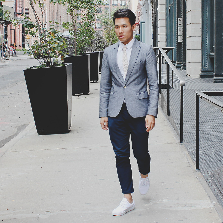 Tất nhiên không thể liệt kê ra hết được tất cả các kiểu dáng của blazer nhưng tôi khuyên bạn nên đi theo hướng đơn giản nhất: blazer 2 khuy cài ở màu xanh navy hoặc nhạt hơn một chút và màu xám đậm. Chiếc blazer của bạn luôn sẵn sàng để mix & match cùng với quần jeans màu đậm, giày loafers và áo sơ mi trắng trong phong cách hàng ngày. Tại công sở, hãy chọn màu quần gần với màu áo, sơ mi và caravat để có được vẻ chững chặc.