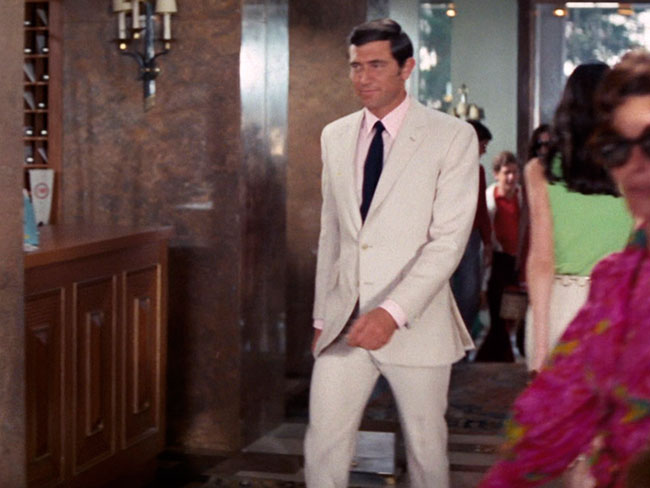 Người ta có thể mau chóng quên đi diễn xuất mờ nhạt của George Lazenby trong loạt phim về Bond nhưng ít ra thì ông đã mang lại một cái nhìn mới mẻ về chàng điệp viên: lần đầu tiên người ta thấy Bond mặc suit mà không phải là màu xám hay xanh. Đây còn là một bộ suit chất liệu linen, phối cùng áo sơ mi hồng và caravat len màu xanh navy, cách vận đồ yêu thích của giới trẻ ngày nay.