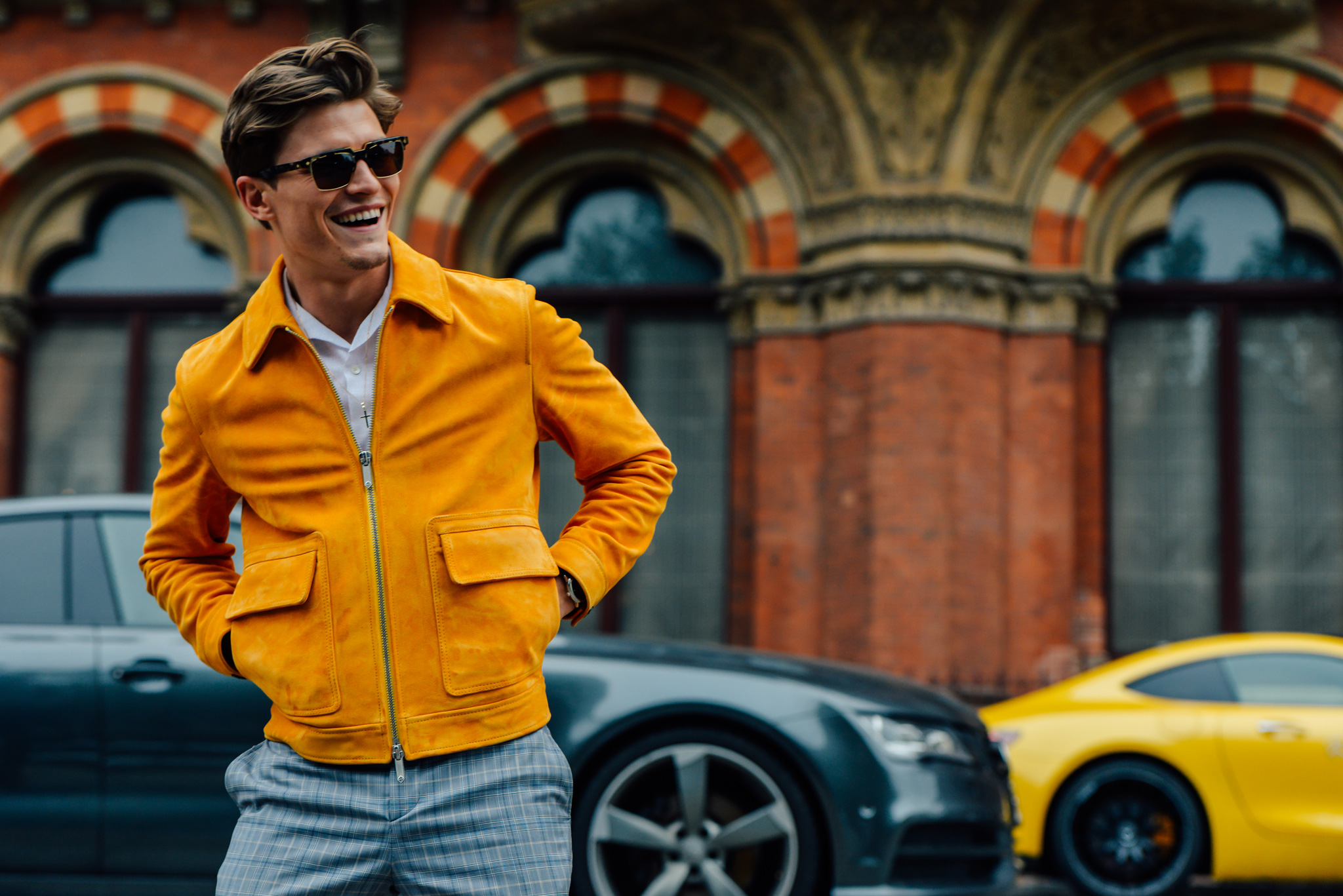 Hãy thử mặc một chiếc áo phông vàng bên dưới áo khoác da màu đen, quần jeans đen và sneakers trắng xem, chắc chắn trông bạn sẽ như đang tràn trề sức sống dưới tiết trời ảm đạm cho mà xem.