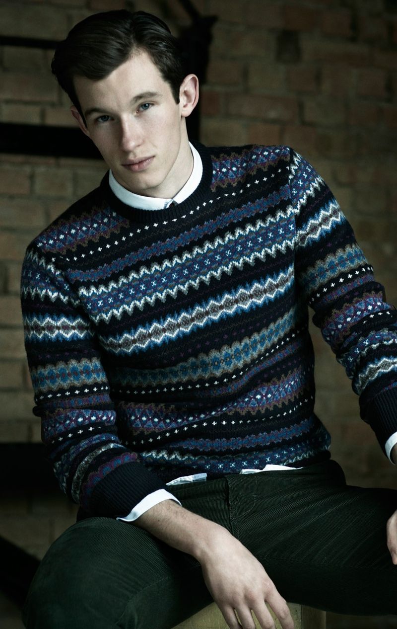 Kết hợp áo len hoạ tiết cổ tròn với cổ áo sơ mi lộ ra từ bên trong, khoác thêm một chiếc áo khoác denim và quần tối màu – bạn sẽ cực kỳ ổn trong mùa Đông.