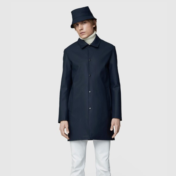 Áo khoác Mackintosh thường có dáng dài tới đùi để tiện che mưa và phom dáng thoải mái để khoác ngoài. Bạn cứ việc mặc đồ đẹp thoải mái, sau đó khoác thêm 1 chiếc Mackintosh màu navy hoặc xám đậm là đủ chiến. Bạn cũng có thể chọn loại có phom ngắn và mặc thay áo gió trong những ngày se lạnh.