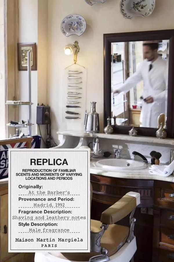 REPLICA là bộ sưu tập nước hoa theo concept rất độc đáo của Maison Martin Margiela, mô tả lại mùi hương của những địa điểm, nơi chốn rất rõ ràng. Đó là By The Fireplace (bên lò sưởi), Jazz Club (CLB nhạc Jazz), Beach Walk (cảm giác đi dạo bên bờ biển) và thậm chí có cả Lazy Sunday Morning (ngày Chủ nhật lười biếng), v.v… Chai nước hoa tôi chọn là At the Barber’s, tôi tò mò muốn biết cách mà MMM “gói” một barbershop vào trong chai ra làm sao.