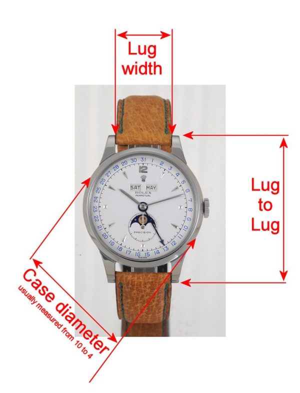 Để đo được chính xác chiều rộng của dây đeo, bạn nên dựa vào khoảng cách giữa 2 tai (lug – phần nối để lắp dây) trên vỏ đồng hồ.