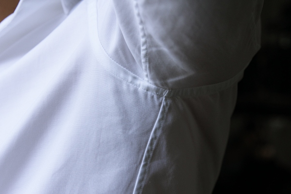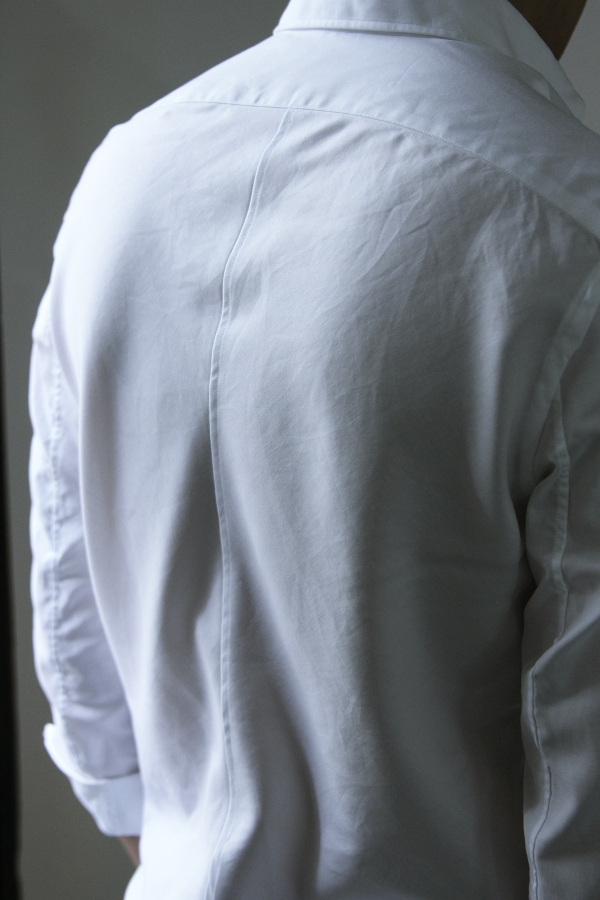 Lưng áo là hai mảnh vải xếp góc chéo 45 độ, được nối bằng một đường may giữa sống lưng. Vì sao phải là xếp chéo chứ không thẳng như truyền thống? Cách may này tạo ra độ co giãn cho vải theo chuyển động vai, mặc dù là vải 100% cotton. Đây là một cách xử lý khá hay nhưng cũng có hạn chế nhất định. Đơn cử như chính vì cách may ráp 2 mảnh, đường may ở giữa rất khó thẳng. Nếu để ý, bạn sẽ thấy ở sống lưng có những đường lượn sóng nhẹ.
