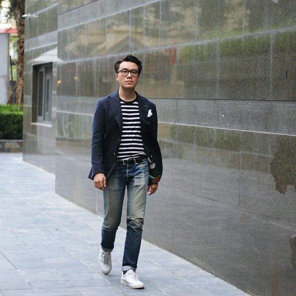 Kết hợp cùng t-shirt kẻ ngang, thay quần trong bộ bằng một chiếc jeans rách nhẹ ở đầu gối, đi đôi giày sneakers trắng yêu thích nữa. Đấy, ai dám nói suit là khô cứng, là khó chiều cơ chứ?