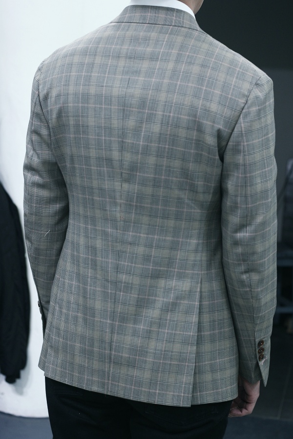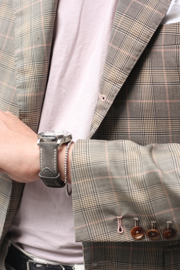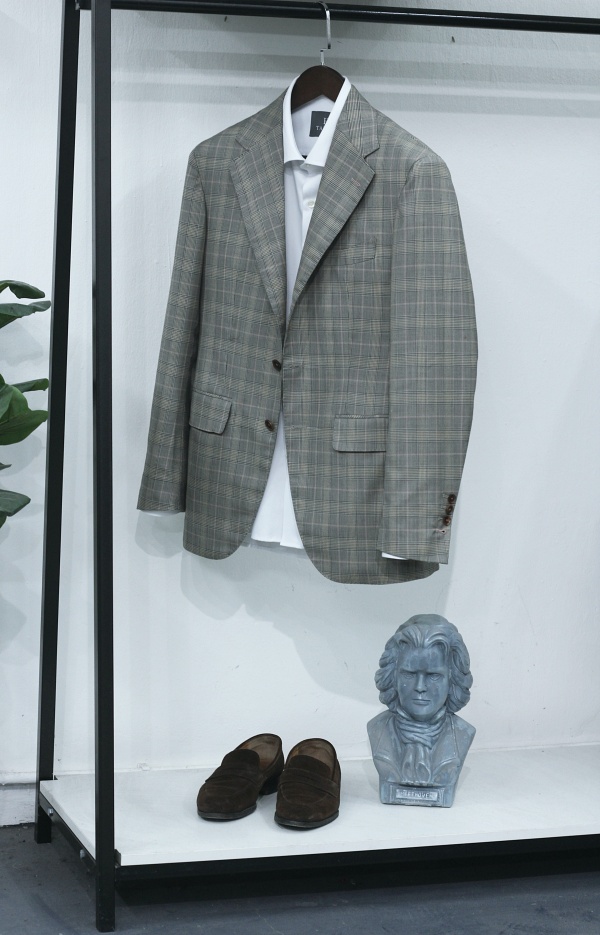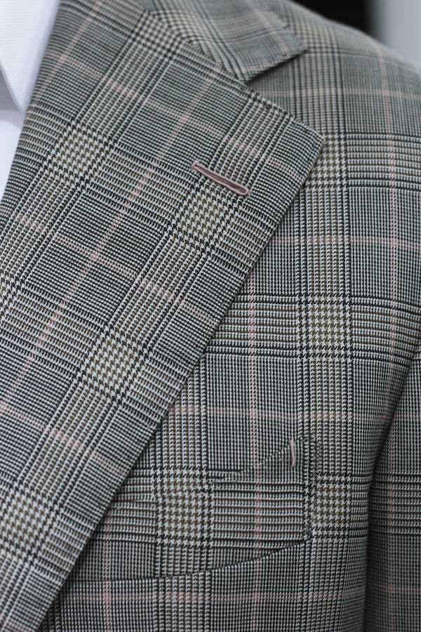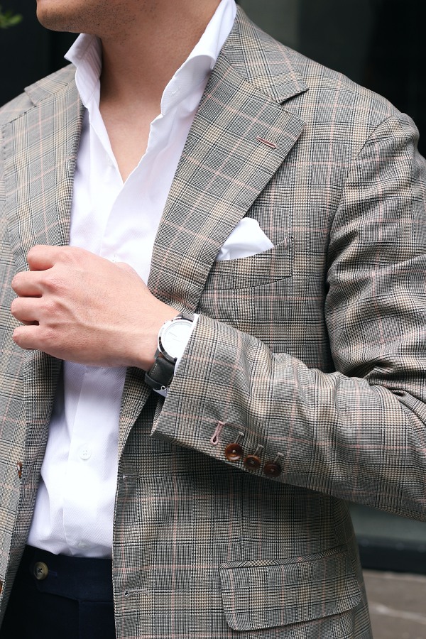 Tôi quyết định đặt may một chiếc blazer mang hoạ tiết kẻ caro từ H Tailor. Cụ thể thì đây là kiểu kẻ Glen Plaid tông nâu chủ đạo, có viền kẻ windowpane màu hồng cam. Một số thông tin về chiếc áo: