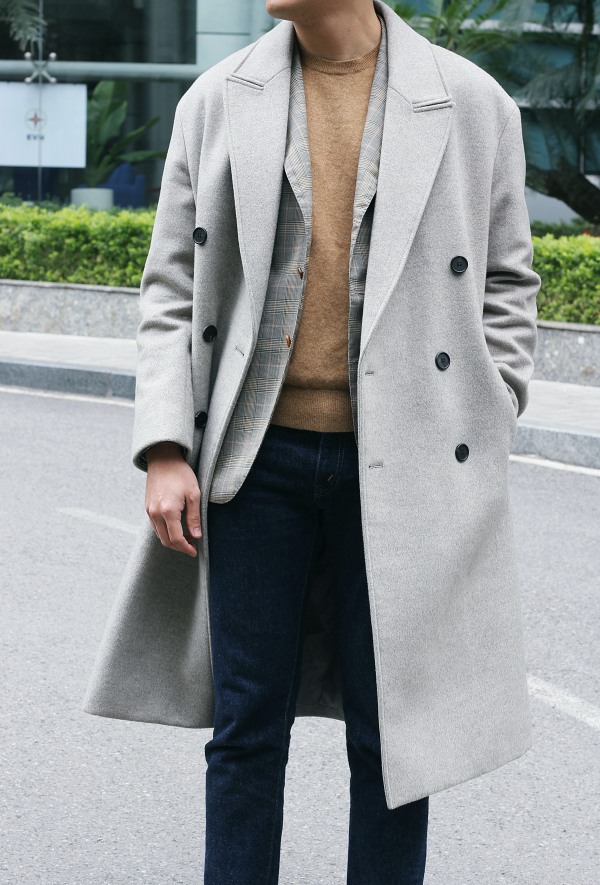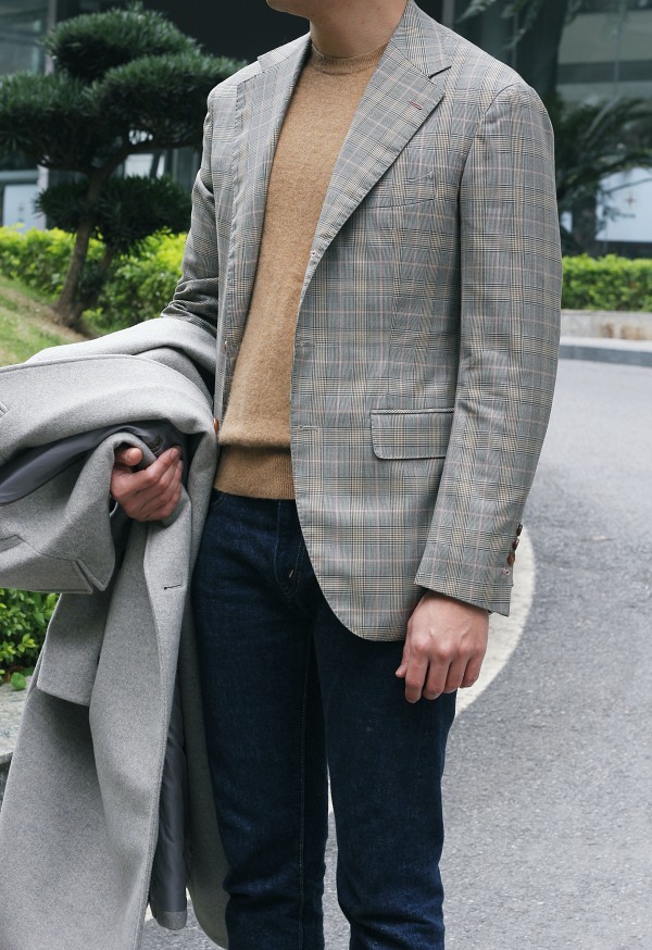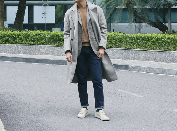 Đầu tiên là set đồ phù hợp với những ngày lạnh thật là lạnh. Chiếc blazer làm lớp áo giữa, bên ngoài là overcoat xám, bên trong là áo len vàng camel, cả 2 đều nằm trong dải màu của áo blazer nên có thể xem là hài hoà, không có chiến tranh gì cho nửa trên trang phục. Sẵn cảm hứng phối đồ casual, tôi chọn quần jeans xanh indigo truyền thống. Không thể thiếu một đôi sneakers màu beige, coi như “nhắc lại” tông màu nâu của áo blazer, tăng thêm sự chặt chẽ về màu sắc cho tổng thể.