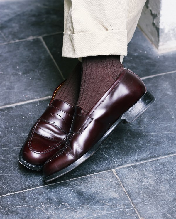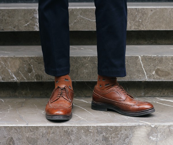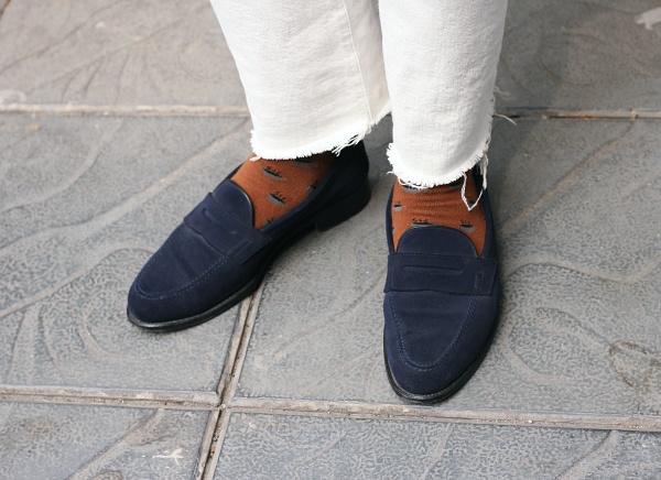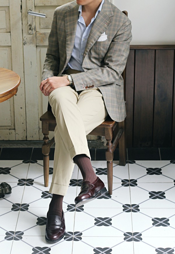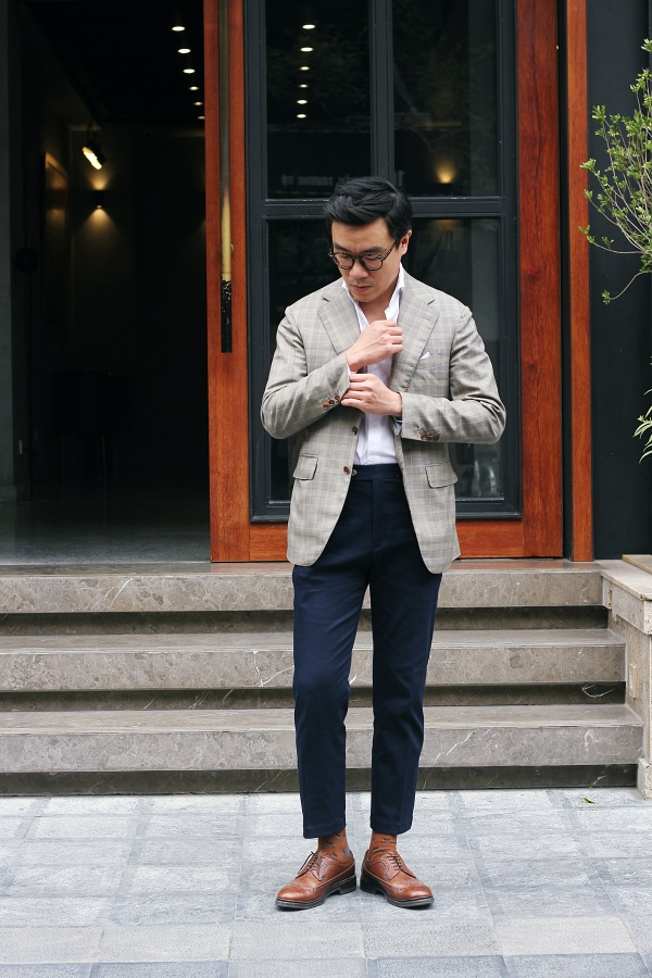 Tận dụng sự linh hoạt thì không thể thiếu sơ mi trắng được. Thêm quần chinos xanh navy với ống cao để tăng tính thoải mái, cũng để khoe hoạ tiết của đôi tất. Giày cũng chỉ là Derby brogues màu nâu rất cơ bản. Vậy thôi, set đồ này hoàn toàn khiến chiếc blazer trở thành nhân vật chính.