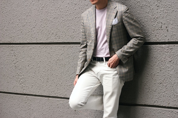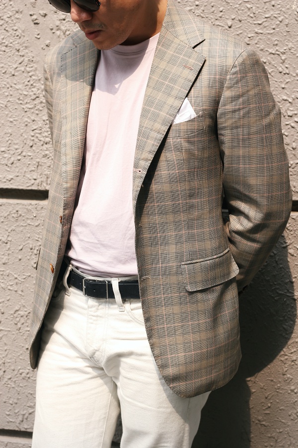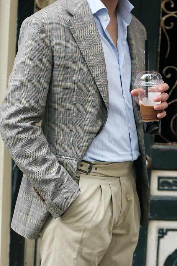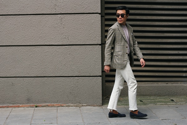 Tôi rất thích tông màu hồng nhạt trên viền kẻ của chiếc áo blazer, nên đã yêu cầu khuyết Milanese, khuyết đầu tiên trên ve áo và tay áo cùng màu này. Lục tủ đồ lại có chiếc t-shirt màu hồng nữa, thế nên phải ốp vào ngay thôi 🤓. Chiếc quần jeans trắng tôi chọn có gấu raw, sợi vải tua rua trông cũng vui mắt hơn. Thêm phụ kiện là thắt lưng da lộn cùng chất liệu và màu với đôi giày loafers.