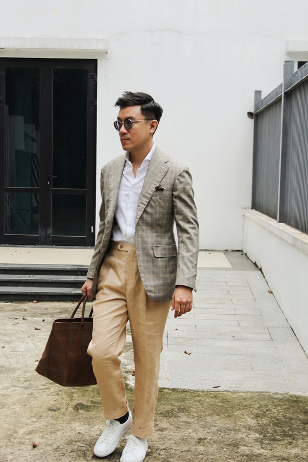 Chia sẻ thật lòng là tôi cũng có một vài bộ suit, nhưng chẳng bao giờ mặc nguyên bộ. Trừ lúc phải mặc dress-code, còn đâu toàn mặc blazer phối cùng các thể loại quần. Nhưng với tôi, bạn có thể mặc suit theo nhiều cách khác nhau: phối cùng t-shirt, áo này phối với quần kia, không nhất thiết phải đóng bộ. Cái nhìn về đồ may đo (tailoring) ngày nay cũng casual hoá đi rất nhiều rồi.
