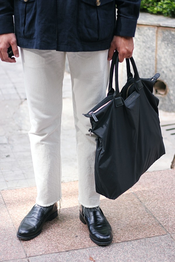 Nhưng cái chất liệu nylon Ý trên túi nó kỳ diệu lắm, túi tote mà lại có độ rủ, drape đẹp như suit. Nylon thì rõ mỏng nhưng bền chắc thì thôi rồi. Đến tận cuối năm ngoái, tôi mới “có thể” tạo nên một vết trầy nhỏ ở đáy túi trong một lần đi xuống dốc bê tông sơ ý bị xòe 😂.