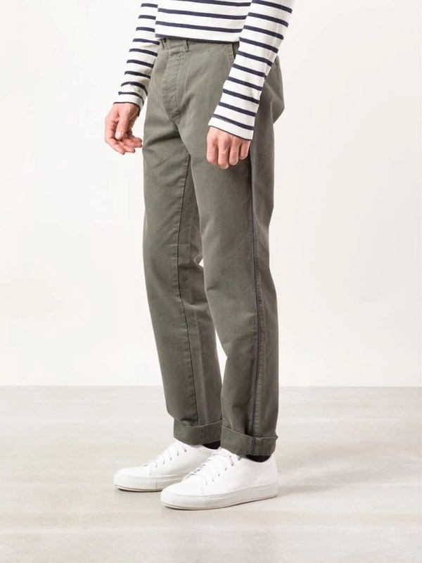 Tôi đặt quần chinos ở đây vì muốn nhấn mạnh vai trò to lớn của chiếc quần này: gạch nối hoàn hảo giữa phong cách casual và formal. Quần chinos điển hình sẽ có chất liệu cotton dệt lóng chéo (cotton twill), màu sắc phổ biến nhất là beige, nâu, navy, xám. Những yếu tố trên biến quần chinos thực sự trở thành lựa chọn hàng đầu mỗi khi lựa chọn trang phục. Đến một kẻ mê jeans như tôi, nhiều lúc cũng thấy “thèm muốn” chinos hơn.