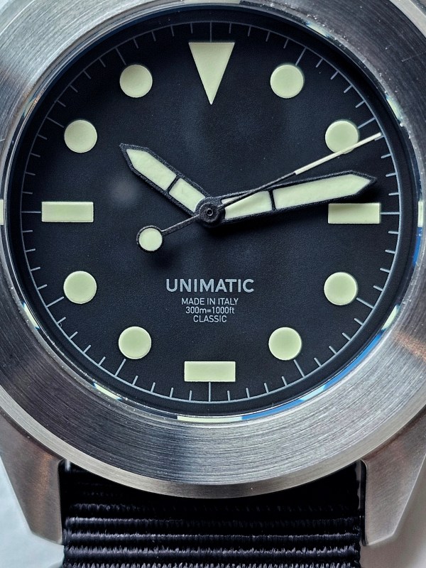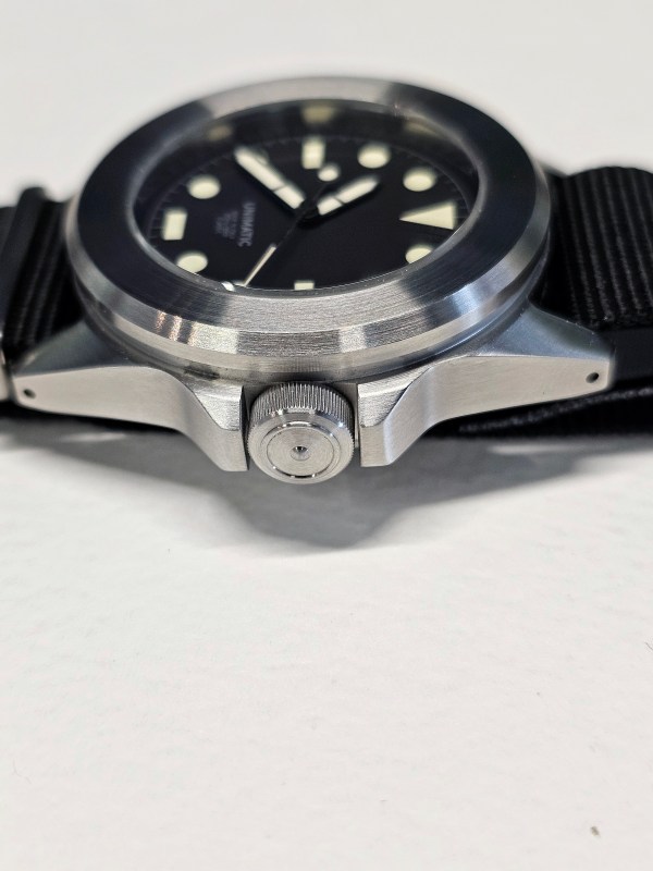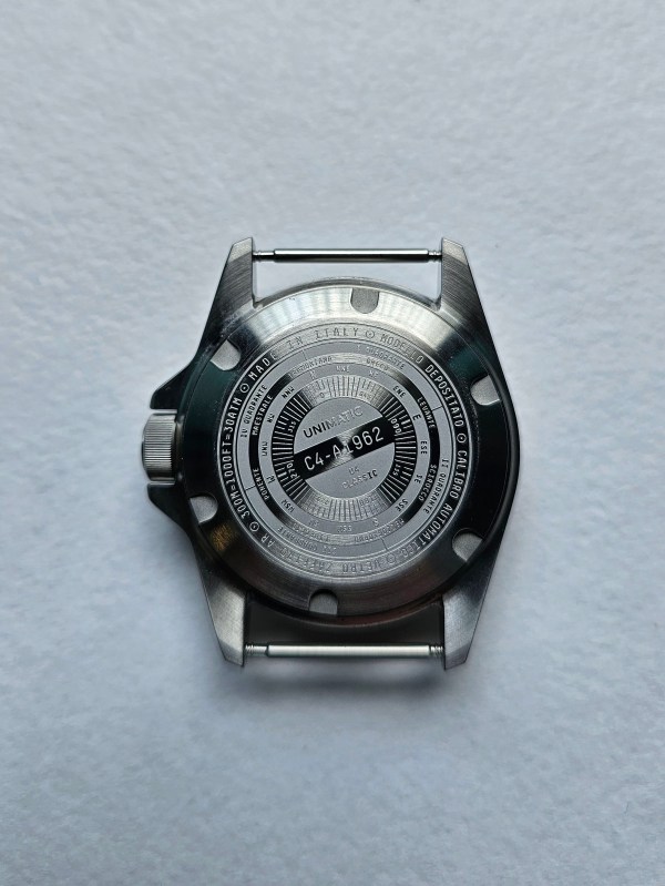 Mỗi một chi tiết thiết kế trên Unimatic U4 đều mang tinh thần “thực chiến” cao, ví dụ như viền vỏ thép hoàn thiện mờ giúp giảm thiểu việc bám dấu vân tay hay trầy xước nhẹ. Núm vặn được thiết kế dạng screw-down, đảm bảo khả năng chống nước lên đến 300m. Đây là yếu tố quan trọng giúp U4 trở thành một chiếc đồng hồ lặn thực thụ. Núm vặn được gia công tỉ mỉ với các đường khía nhỏ, giúp tăng độ bám khi thao tác, hữu ích khi cần điều chỉnh trong môi trường ẩm ướt hoặc đeo găng tay. Những chi tiết này tạo cảm quan mạnh mẽ và làm nổi bật tính thực dụng và độ bền của một chiếc tool watch.