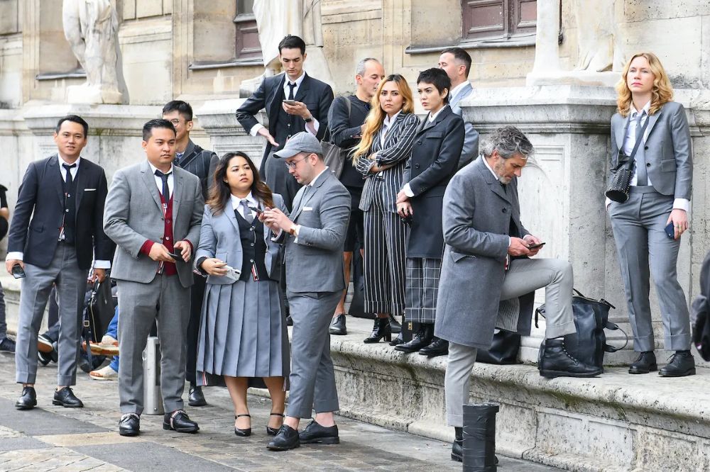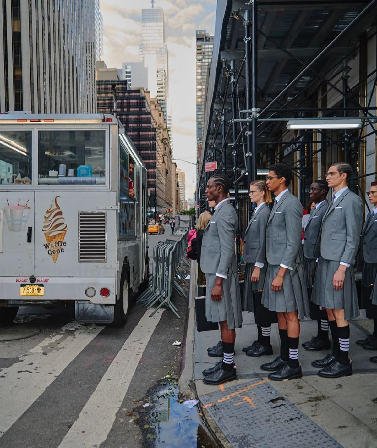Bộ suit xám “co rút” của Thom Browne phá hết mọi luật lệ về tỷ lệ của suit. Không tôn dáng. Mắc tiền. Khó mặc. Nhưng nó lại tuyệt vời và đẹp kỳ lạ. Lần đầu tôi thấy nó là 20 năm trước, gần studio của Thom ở Chelsea. Một nhóm nhân viên trẻ của ông băng qua 10th Avenue: suit xám, sơ mi trắng, cà vạt nhét vào cạp quần, giày đen wingtip, lộ mắt cá đầy khiêu khích. Tôi đứng hình. Từ đó, tôi luôn nể Thom Browne. Tôi cũng không bất ngờ khi ông bán 85% thương hiệu cho Zegna với giá 500 triệu USD vào năm 2018. Tôi đã chứng kiến sức mạnh thương hiệu ấy. Báo chí viết nhiều rồi, nên tôi không đi sâu nữa.